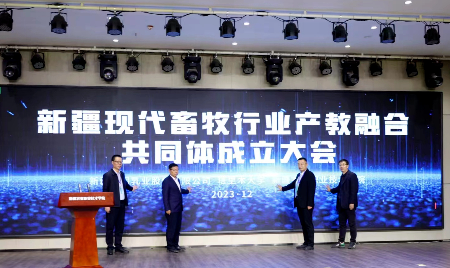 新疆现代畜牧行业产教融合共同体以服务现代农业产业发展为宗旨,以现代畜牧为纽带,在自治区农业农村厅、教育厅的指导下,由现代畜牧相关企业、行业、培训机构、科研院所、高水平高等学校,高、中等职业院校多方参与,以实现资源共享、校企合作、构建畜牧业职业教育体系为目的,以产学研一体化为途径,在自愿、协作的基础上形成的非独立法人组织。“共同体”由新疆天润乳业股份有限公司、塔里木大学、新疆农业职业技术学院三家单位共同牵头成立,成立大会上宣读并表决通过了理事会章程和组织机构名单。塔里木大学被授予新疆现代畜牧行业产教融合共同体理事长单位。(文/摄 麦尔旦·穆合太尔)