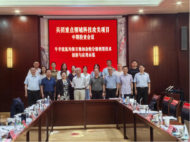 2025年7月24-25日, 兵团重点领域科技攻关项目“牛羊低氮均衡日粮和杂粕分级利用技术创新与应用示范”中期检查会议在塔里木大学召开,课题承担单位领导新疆农垦科学院科研处张斌副处长,以及塔里木大学科技处张锐利副处长、动物科学与技术学院齐萌副院长莅临会议并讲话。项目邀请西北农林科技大学陈玉林原副校长/教授、中国科学院亚热带农业生态研究所谭支良书记/研究员、新疆农垦科学院尹君亮原党委委员/研究员、新疆农业大学刘武军教授、江苏波杜农牧股份有限公司尤佩华董事长等,作为专家团队对项目的推进情况进行了检查指导。该项目负责人王梦芝教授及其团队,各课题负责人新疆农垦科学院陈宁研究员,塔里木大学郭雪峰/周小玲教授,石河子大学吴妍妍副教授等及其团队成员参加会议。