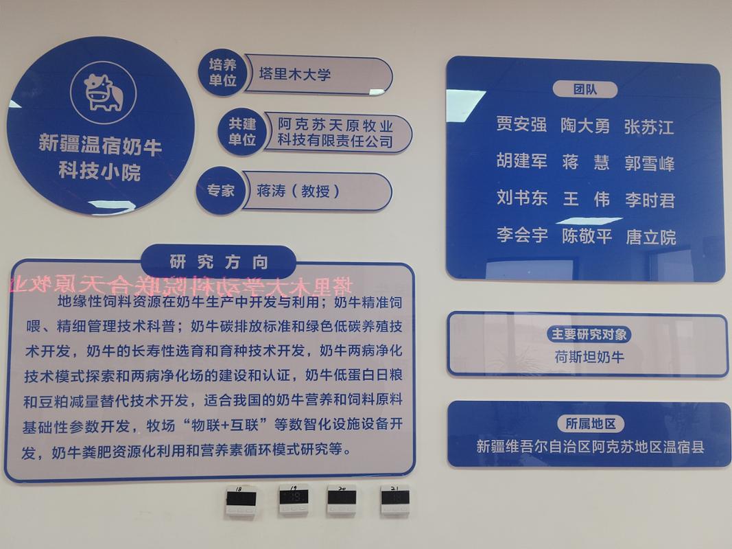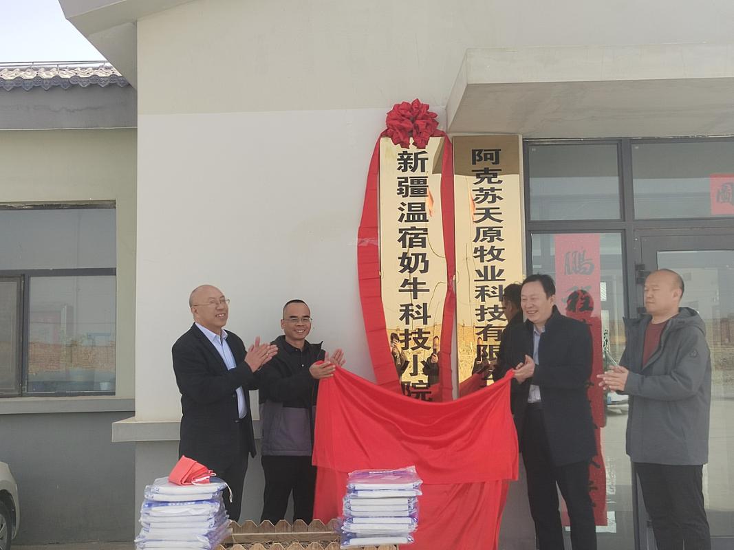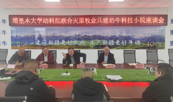 为深化产教融合,推动教育链、人才链与产业链、创新链的有效衔接,我校动物科学与技术学院院长井波与奶产业技术体系岗位专家蒋涛教授及团队陶大勇教授、刘书东教授、研究生李睿岩一行前往阿克苏天原牧业有限公司,共同商讨“科技小院”的建设。2026年3月8日,我校动物科学与技术学院与阿克苏天原牧业有限公司(以下简称天原牧业)合作共建的“新疆温宿奶牛科技小院”揭牌仪式在企业所在地举行。