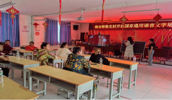 课堂开始,当地负责交接的老师用维吾尔语对村民强调了学习普通话的重要性,鼓励村民认真听讲。然后,选出一位同学将准备好的课件拷贝在电脑上,课件上的内容从基础讲起,先从普通话的发音教起,讲解老师领读一句,村民跟读一句,效果还为不错。