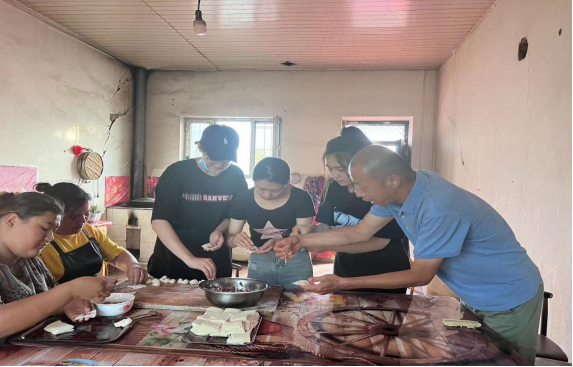 (图为同学们与当地居民一起包饺子)