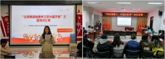 11月11日至18日,“民族一家亲,共谱民族情”有奖问答活动在东区三号食堂门前顺利开展。本次活动共计1500余人参与,活动成效显著,对加强各民族同学之间的联系有强烈的推动作用。11月22日下午,“让民族团结之花长盛不衰”演讲比赛在东十宿舍楼党团活动室顺利举办。29名学生参加此次活动,选手们围绕民族团结这一主题,结合自身亲身经历,展开了热情洋溢的演讲。