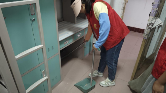 志愿者们手持清洁工具,分组有序地进行清洁工作,对楼梯间的扶手和墙壁、楼道、公共区域的垃圾桶、各类卫生死角进行打扫和清洁。志愿者们不畏炎热,辛勤劳动,用实际行动表达了对学弟学妹们的热情欢迎。